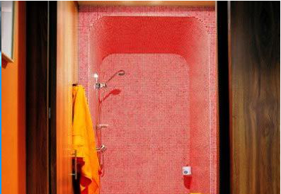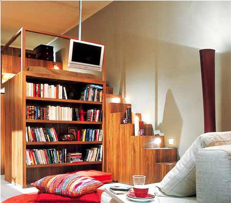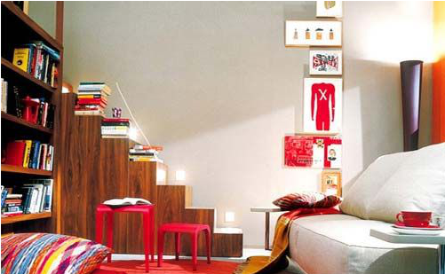 沙发四周安排了足够多的亮色红,统一的色调运用不仅避免了杂乱感,还令小蜗居的上下结构更紧密地连接在一起。